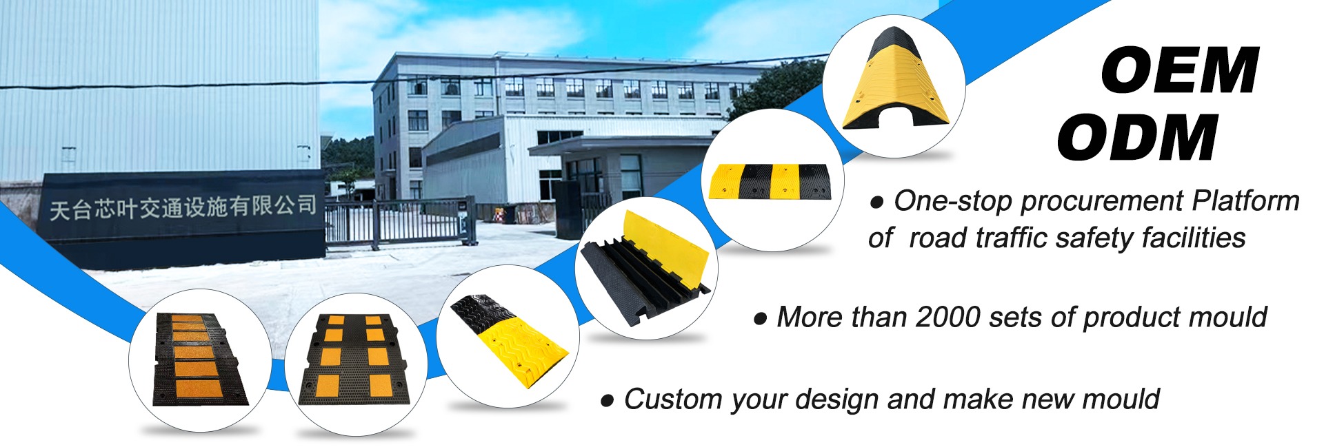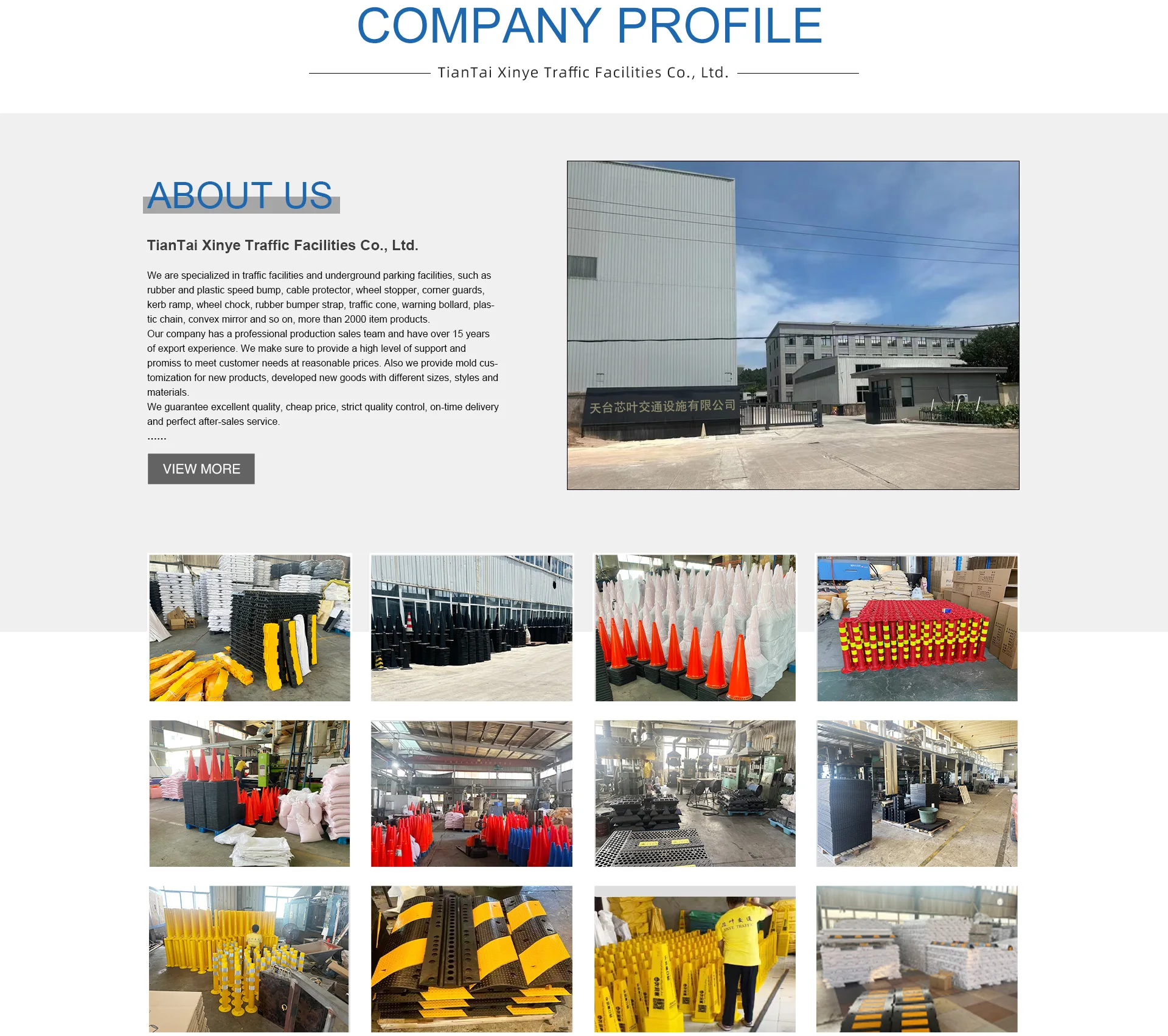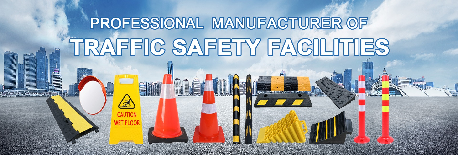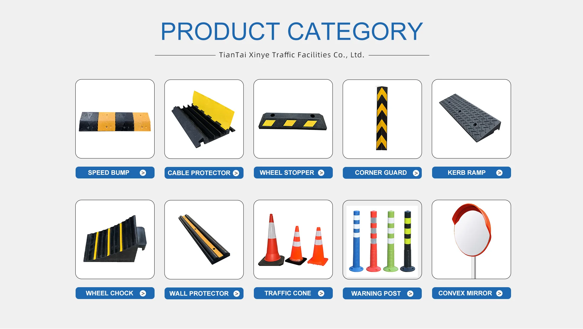 Our company specializes in Speed bump/Cable protector/Wheel stopper/Corner guards/Kerb ramp/Wheel chock/ Warning post/Traffic cone/Warning post/Convex mirror/Plastic chain and so on...
